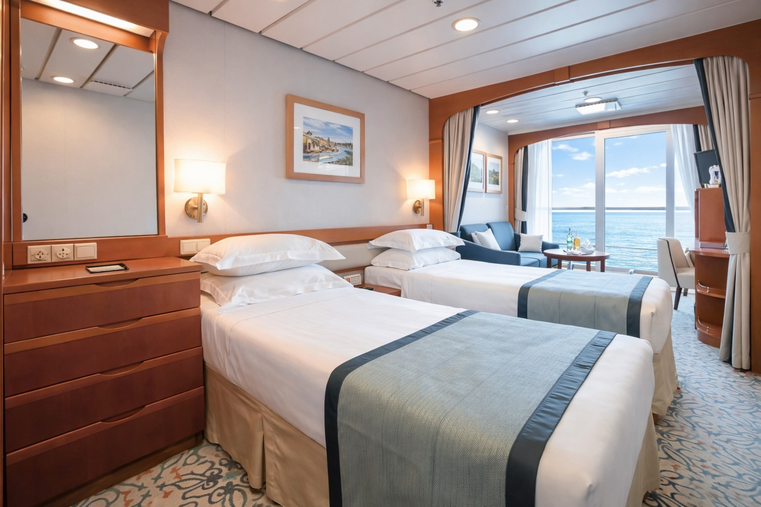 Relaxe em uma cabine aconchegante com cama king-size, banheiro privativo e uma janela panorâmica com vistas deslumbrantes do mar.